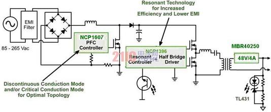 2)基於NCP1607和NCP1397的超高能效大功率LED街燈電源方案近年來,業界對超高能效的LED照明拓撲結構興趣日濃,期望在功率電平相對較低(<50W)時提供高於90%的能效,這個能效目標甚至比“能源之星”2.0版外部電源能效要求(功率不超過49W時能效高於87%)更高。要達到這樣高的能效,需要采用新的拓撲結構,如從反激拓撲結構轉向諧振半橋拓撲結構,從而充分發揮零電壓開關(ZVS)的優勢。有利的是,安森美半導體早已著手開發能用於LED驅動電源的高能效半橋解決方案,如NCP1396及其升級版NCP1397高性能諧振模式控製器。NCP1397內置高端和低端驅動器,支持可調節及精確的最低頻率,提供極高能效,並具備多種故障保護特性。基於NCP1607PFC控製器和NCP1397雙電感加單電容(LLC)半橋諧振控製器的LED電源方案(見圖2)非常適合功率在50到300W範圍的高能效LED街道照明應用。[page]