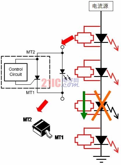 增強LED串可靠性的保護方案如前所述,區域照明應用中通常會采用多串LED。雖然LED本身的可靠性很高,但如果LED串中的某個LED發生開路故障,那麼整串LED就可能關閉,而街道照明等應用中就要避免這種狀況,從而降低後期維護成本。有鑒於此,安森美半導體推出了NUD4700 LED電流旁路保護器(見圖3)。這器件是一款分流器件,萬一LED串中某個LED開路,則會提供電流旁路,確保在某個LED故障的條件下整串LED不會關閉;而且恰當處理散熱的話,還可支持大於1 A的大電流。