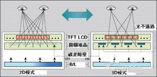 這些條紋寬幾十微米,通過它們的光就形成了垂直的細條柵模式,稱之為“視差障壁”。而該技術正是利用了安置在背光模塊及LCD麵板間的視差障壁,在立體顯示模式下,應該由左眼看到的圖像顯示在液晶屏上時,不透明的條紋會遮擋右眼;同理,應該由右眼看到的圖像顯示在液晶屏上時,不透明的條紋會遮擋左眼,通過將左眼和右眼的可視畫麵分開,使觀者看到3D影像。