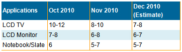 中國液晶電視麵板進口量預計將從2010年第四季度的1千5百萬台下降到2011年第一季度的1千3百萬台。2010年第四季度和2011年第一季度期間,我們估計樂金顯示和夏普將從新奇美手中贏得部分市場份額。