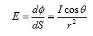 照度(Luminosity)指物體被照亮的程度,采用單位麵積所接受的光通量來表示,表示單位為勒[克斯](Lux),即lm/m2。1勒[克斯]等於1流[明](lm)的光通量均勻分布於1m2麵積上的光照度。LED陣列的照度是多個單個LED照度的線性疊加。因此隻分析單個LED照度。通常LED所照射的目標距離比LED本身大的多,在這種情況下將LED發光管簡化為一個有一定空間光強分布的點光源。點光源的特點是能以4立體角向周圍空間發出相同發光強度的光輻射。假設麵元dS接受LED點光源S的光照,設點光源S至麵元dS的距離為r,並且點光源發出的元光束的光軸與麵元的法線N之間的夾角為,則麵元上的照度為: