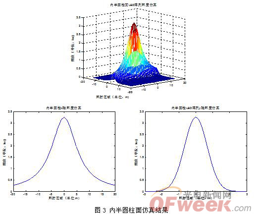 比較仿真結果可以得出,平麵分布陣列的光照麵積小、光輸出集中、發光均勻、光照度高,可以應用於模塊照明、照相製版、化妝鏡燈、聚光(投光)燈等;曲麵分布陣列照射麵積較大,具有發散的照明效果,可獲得特殊的裝飾照明效果,適用於廣場燈、路燈等。