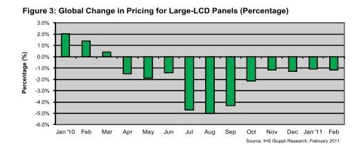 預計2月份大尺寸LCD電視麵板價格下降1.2%。但是,10月以來價格下滑速度不斷放緩,2月降幅是2010年6月以來最小。未來兩個月麵板價格可能保持平穩,4月將推出新款電視,而5月中國將迎來勞動節假日。