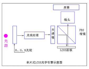 LCOS顯示麵板其中一麵以CMOS芯片為基板,無法讓光線直接穿過,因此采用穿透式成像方式,因此其背投光學係統和LCD背投影機便產生了區別。通常LCOS光學係統中需要利用偏極化分光鏡(PolarizationBeamSplitter:PBS),將入射LCOS麵板的光線與反射的光線分開。PBS是由兩個45度等腰直角棱鏡底邊粘合的而成的棱鏡,當非線性偏極化光入射PBS時,PBS會反射入射光的S偏振光(垂直入射線平麵),並且讓P偏振光(平行入射線平麵)通過。關於LCOS光學係統技術仍在起步階段,所以IBM、ColorQuad、Philip、Hologram等多家廠商都開發了不同的LCOS光學引擎架構。但主要可分為單片式和三片式兩大類,如下: