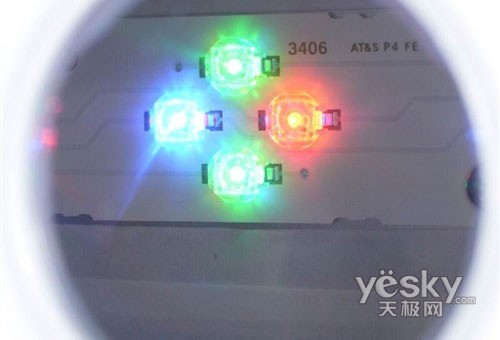 索尼70X300A上使用的RGB-LED背光單元放大圖,每一組由2個綠光、1個紅光和1個藍光LED元件組成