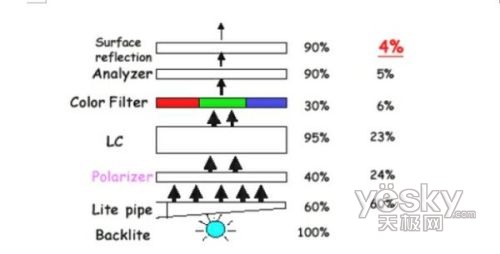 首先,這種方法省去了彩色濾色片,而濾色片是光能的主要吸收者,它會損失光能70%以上。下圖表明了光能從光源出發以後所受到的損失。