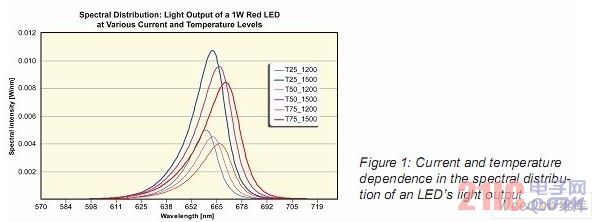 LED的光輸出特性主要取決於其工作條件。前向電流增加會使LED產生更多的光。但當前向電流保持不變,光輸出會隨著LED的溫度升高而下降。圖1描述了溫度,電流和光輸出的關係。並且描述了一個LED相關的顏色光譜在峰值波長處的偏移。用於普通照明的單色LED,藍色光譜的峰值會發生偏移,因此改變了LED所謂的色溫。這會對LED照明空間內的感官產生影響。