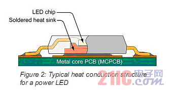 熱量從LED封裝芯片開始傳遞,相關的數據由供應商提供。圖2中顯示的是常見的導熱結構。一個LED燈大約50%的結點至環境的熱阻由LED封裝所引起。