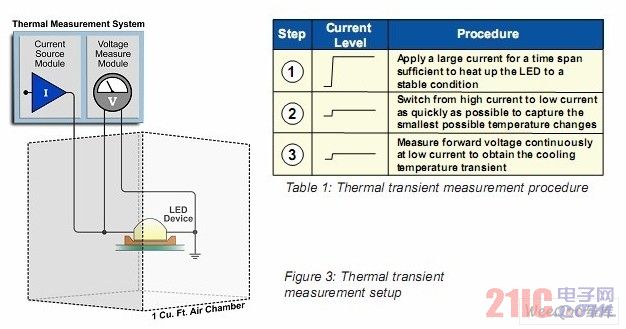 在JEDECJESD51-1標準定義的靜態測試條件下,一旦LED處於熱的狀態,它的前向電流突然降低到一個非常低的測量電流水平,IM(表格1中第2步)。事實上LED被關閉,產生了一個負的功率。在這個階段,測量相應的電壓(表格1第3步)。從LED的前向電壓改變推算LED結溫的改變。