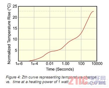 在電子行業,術語“Z”代表阻抗,在我們的例子中代表熱阻抗。在熱阻抗的曲線中,其表示溫差除以熱功耗的值。因此,圖4中的Z曲線表述了對於1W熱功耗的溫度改變。