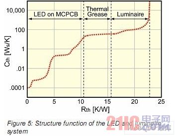 在圖5中,最初的曲線非常陡峭,同時熱容被加熱。這個曲線進行了注解,描述了LED/MCPCB,封固劑(導熱矽脂)和照明設備三個階段。但在第一個階段內,曲線描述了更小的一些階段,譬如Dieattach,散熱板,甚至是緊固銅散熱板和MCPCB的膠水。注意這個圖形證實了早期的一個論點,那就是LED自身的熱阻占整個係統結點至環境熱阻的50%。