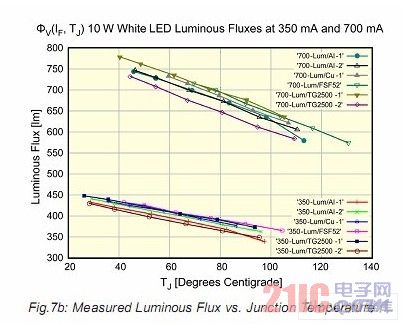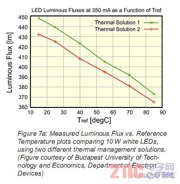 在圖7a中顯示了兩個同一廠商的兩個白色LED光通量和參考溫度的關係,這兩個LED具有不同的散熱方式。散熱方式1使用了一塊金屬的PCB板,而散熱方式2使用了傳統的FR4板。此外,兩個LED樣品的PCB板和散熱器之間使用了不同的導熱界麵材料。