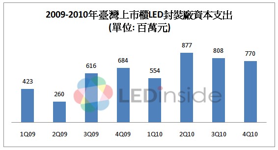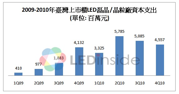 2010年由於受惠於LED背光源與LED照明需求明確加溫,產能用率攀升,台廠大幅擴充資本支出,積極提高資本支出以擴增產,至2010年底,台灣地區廠商的資本支出總額達217.6億元,比2009年的資本支出總額成長達2.32倍,如下表所示。