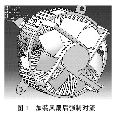 主動散熱常用液冷、熱管、風(feng)冷(leng)等(deng)方(fang)式(shi)。由(you)於(yu)液(ye)冷(leng)使(shi)用(yong)的(de)液(ye)體(ti)必(bi)須(xu)在(zai)泵(beng)的(de)帶(dai)動(dong)下(xia)強(qiang)製(zhi)循(xun)環(huan)帶(dai)走(zou)散(san)熱(re)器(qi)的(de)熱(re)量(liang),熱(re)管(guan)則(ze)依(yi)靠(kao)高(gao)導(dao)熱(re)性(xing)能(neng)的(de)傳(chuan)熱(re)元(yuan)件(jian)在(zai)全(quan)封(feng)閉(bi)真(zhen)空(kong)管(guan)內(nei)的(de)液(ye)體(ti)的(de)蒸(zheng)發(fa)與(yu)凝(ning)結(jie)來(lai)傳(chuan)遞(di)熱(re)量(liang),二(er)者(zhe)都(dou)不(bu)適(shi)合(he)車(che)燈(deng)內(nei)使(shi)用(yong)。風(feng)冷(leng)散(san)熱(re)具(ju)有(you)價(jia)格(ge)較(jiao)低(di)、安裝簡單等優點最為常用。針對被動散熱方式存在的散熱器中心區域溫度相對集中的情況,加裝風扇強製對流後(見圖1),對緩解散熱器溫度不均勻有明顯效果。
