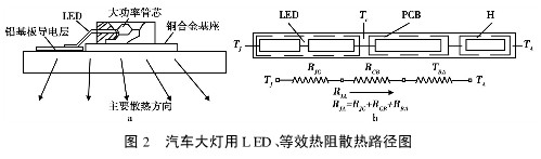 本文研究的LED汽車前大燈主要散熱路徑是:管芯→銅合金基板→鋁基板→散熱器或機殼→環境空氣,(見圖2b)。若LED的結溫為TJ,環境空氣的溫度為TA,散熱墊底部的溫度為Tc(TJ>Tc>TA),在熱傳導過程中,各種材料的導熱性能不同,即有不同的熱阻。管芯傳導到散熱墊底麵的熱阻為RJC(LED的熱阻)、散熱墊傳導到PCB麵層敷銅層的熱阻為RCB、PCB傳導到環境空氣的熱阻為RBA,則從管芯的結溫TJ傳導到空氣TA的總熱阻RJA,RJA與各熱阻關係為:RJA=RJC+RCB+RBA,銅合金基板和鋁基板導熱性能接近且熱阻小,其導熱性能就好,即散熱性能也越好。該散熱結構的總熱阻比常規結構減少近26%。