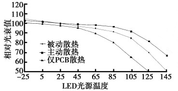圖4是LED光源溫度與光衰在不同的散熱方式下的關係曲線。圖中可見僅PCB散熱、加散熱器的被動散熱和強製對流的主動散熱3種不同散熱設計存在相當大的差異。後二種在105℃時,基本上能夠提供80%以上的出光率。