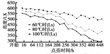 我們對圖3b所示的前大燈樣件做了不同條件下的光衰測試,試驗建立在LED散熱良好的基礎上,模組安裝在大燈封閉殼體內,溫度檢測點在LED光源附近。試驗數據采集時的環境溫度是在燈體外部施加的。試驗結果表明環境溫度60℃時,光衰緩慢;100℃時,光衰加劇(見圖6)。
