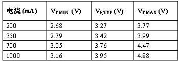 表 1:大電流白光 LED 的正向壓降與驅動電流。