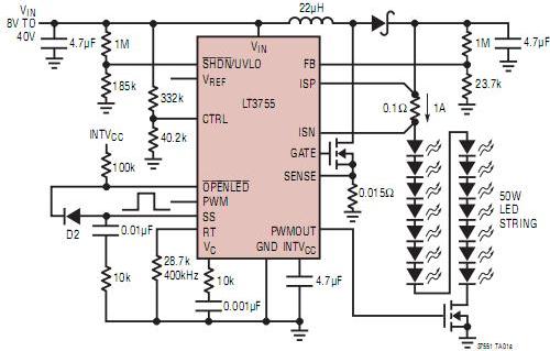 大多數前燈應用需要約 50W LED 電流。淩力爾特公司的 LT3755 設計成服務於這種類型的應用。它可以將汽車總線電壓(標稱值為 12V)提高到 60V,以驅動多達 14 個串聯連接的 1A LED,如圖1所示。