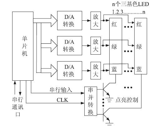 如圖2 中,87LPC762 單片機傳送數據到三路D /A 轉換器,將數字量轉換為模擬量,經功率放大電路分別控製紅、綠、藍三色LED 發光的強度,從而控製LED 發光的顏色以及亮度, 對於多個LED采用動態掃描的方式,由單片機控製兩個輸出端子以CLK 為基準輸出串行信號,經串並轉換器件控製處於開關工作的三極管分別對三基色LED 進行點亮,完成對圖形圖案的控製。最後,此係統即可完成調光所需的各項功能。串行通訊接口采用RS232標準總線與計算機連接,可將計算機中需要顯示的圖案或文字傳送到本係統並顯示出來。