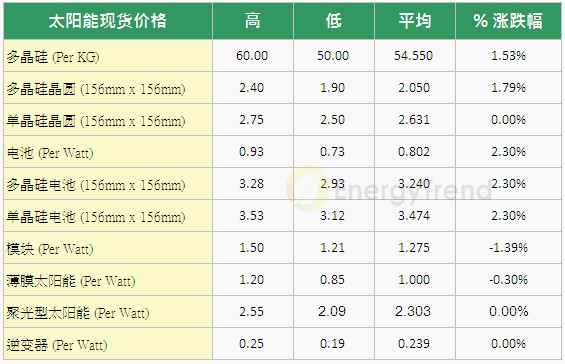 本周調查結果顯示,上遊的多晶矽平均成交價來到$54.55/kg,漲幅為1.53%。在矽外延片方麵,多晶矽外延片平均價格微幅上揚到$2.05/piece,漲幅為1.79%。而單晶矽外延片本週平均價格仍維持在$2.631/piece,與上周相同。另一方麵,太陽能電池的需求受到市場需求轉向的影響,高效率產品的需求仍維持熱絡,售價也維持相對高檔;但在轉換效率偏低的產品方麵,交易價格麵臨較大的壓力,然而本周電池平均價格上漲到$0.802/Watt,漲幅為2.3%。而在模組市場方麵,平均交易價格滑落到$1.275/Watt,跌幅為1.39%。另一方麵,薄膜市場價格受到印度市場價格影響,出現微幅滑落,目前價位在$1.000/Watt,跌幅為0.3%。