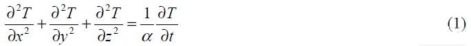 其中:T 為溫度;t 為時間;x, y, z 空間三維坐標係;α 為熱膨脹係數,α 滿足方程: