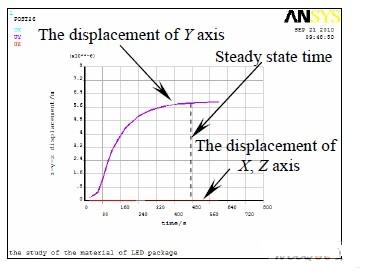 芯片頂麵中心節點的位移隨時間變化曲線如圖7 所示,X 和Z 方向位移近似為零,Y 方向的位移隨著時間和溫度場的變化而不斷變化(Y 向為器件縱向即溫度傳遞方向),在光源點亮500 s 左右後,溫度場進入穩定狀態,此時芯片應變量達到最大6.3 μm,與瞬態溫度場的變化相符。