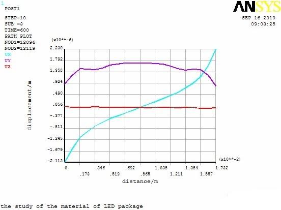 圖4(a)是Lumileds 1 W LED 在最終時刻(600 s)後總位移雲圖,內部帶網格雲圖表示未變形前的結構,另一個實體雲圖表示LED 在(zai)受(shou)熱(re)膨(peng)脹(zhang)後(hou)的(de)變(bian)形(xing)效(xiao)果(guo),這(zhe)裏(li)對(dui)變(bian)形(xing)量(liang)按(an)比(bi)例(li)進(jin)行(xing)了(le)放(fang)大(da)。由(you)圖(tu)可(ke)見(jian),熱(re)變(bian)形(xing)主(zhu)要(yao)集(ji)中(zhong)在(zai)透(tou)鏡(jing)和(he)塑(su)封(feng)料(liao)處(chu),特(te)別(bie)是(shi)透(tou)鏡(jing)與(yu)塑(su)封(feng)料(liao)接(jie)觸(chu)地(di)方(fang),最(zui)大(da)變(bian)形(xing)量(liang)達(da)到(dao)6.3 μm。由於基板底部加了X、Y、Z 三個方向約束,相當於基板底部被固定,因此基板底部位移量為0 μm。