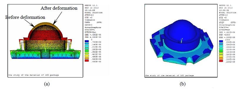 圖4 Lumileds 1 W LED 的熱變形雲圖(a)和等效應力雲圖(b)