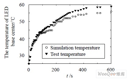圖3 Lumileds 1W LED 基板中心點溫度實測數據與仿真數據對比