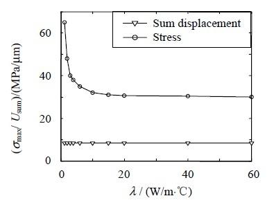 圖12 LED 芯片最大應力及應變隨著鍵合層導熱係數變化曲線