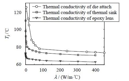 由圖可知,LED 結溫隨著熱沉和鍵合層導熱係數的變化趨勢類似,當λ 較小時,隨著λ 增大,結溫迅速降低;當λ 較大時,隨著各種材料導熱係數變化,結溫變化平緩。這是因為當λ 較小時,各材料的熱阻較大,而當λ 較大時,熱阻減小,熱量能順利傳出,此時導熱係數不再是影響整個係統傳熱效果的主要因素。由於LED 傳熱並不經過透鏡,所以透鏡的導熱係數對LED 的結溫變化影響很小。