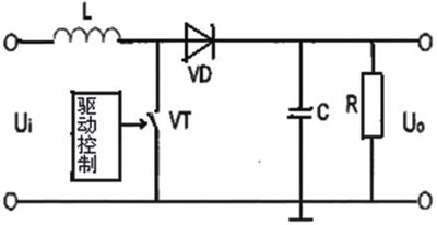 Boost變換器亦稱並聯開關變換器。當驅動控製信號使開關晶體管VT導通時,能量從輸入電源輸入,並存儲於電感L中,二極管VD反偏,負載由濾波電容C供給能量。