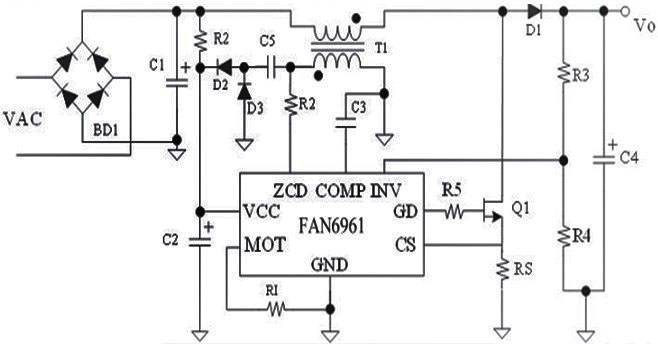 Boost變換器的控製芯片為FAN6961,需要一輔助繞組,根據FAN6961的使用說明可知其匝數由式(5)決定: