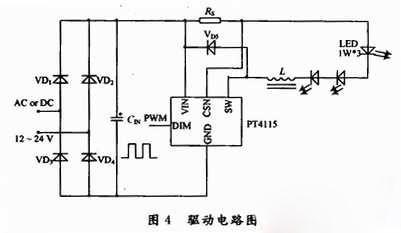 這裏采用LED驅動芯片PT4115。PT4115是一款連續電感電流導通模式的降壓恒流源IC,能將直流電壓直接轉換成穩定的恒流輸出。