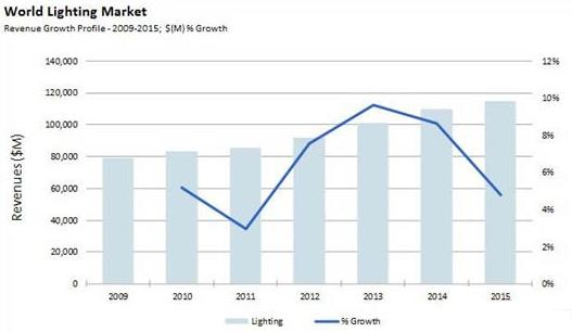 IMS Research的最新分析顯示,2010年全球照明市場價值830億美金,其中電光源部分占24%。到2015年,整個照明市場將會達到1150億美金,電光源部分占到33%。