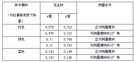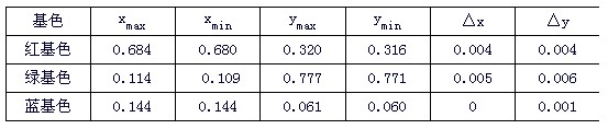 在暗室條件下,LED全彩屏又具有高亮度的特性,外界雜散光的影響就變得微乎其微了;而LED的工作電流,由恒流驅動控製電路保持在20mA,並相對穩定,工作電流波動的影響雖然存在,但不會影響整個衰減過程的總體趨勢;試驗過程中的環境溫度的變化對LED色坐標的影響更多的是長期宏觀的;測量誤差的影響可以用表1進行說明: