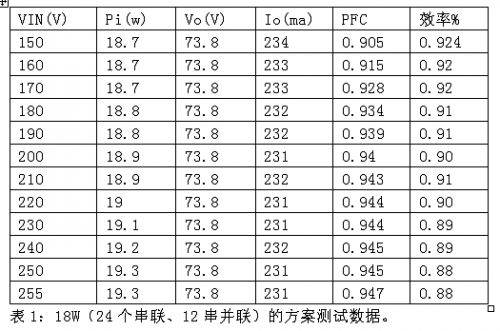 在AX2028_TUBE_18W非隔離應用設計(圖4)中,LED光源陣列設計為0.06W白光LED(SMT或草帽燈)24個串聯、12串並聯的方案,驅動288個小功率WLED,總功率為18W。