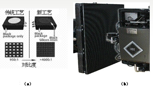 如圖1所示,(a)左側為傳統工藝的LED發光管。一般為黑色麵碗LED發光管,管芯為白色。(a)右側為Barco公司采用新技術,使用黑色管芯,有效提高了對比度指標。(b)圖為采用新工藝的P4間距SMD顯示屏模組。