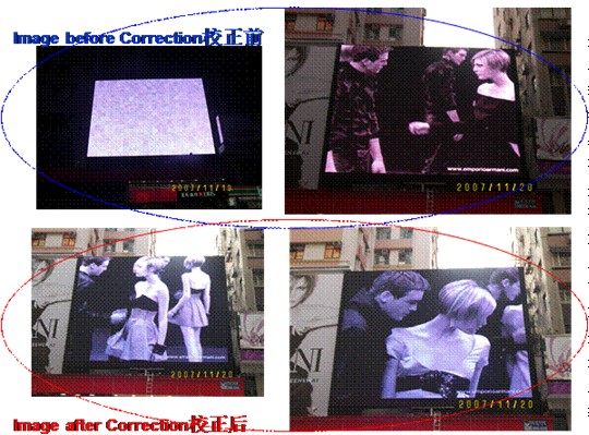為了徹底改善顯示顯示屏均勻性的問題,需利用專用采集設備在現場對LED顯示屏的每個像素點的光色信息進行快速準確的采集,通過相關算法對每個LED發光管的實際衰減程度進行補償,從而實現真正意義上的一致化校正,即使對於運行不同時間的LED模塊也能實現像素級別的校準。經過校正,使顯示屏恢複至剛出廠時的均勻顯示效果。