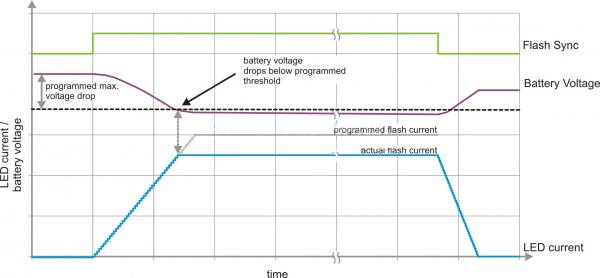 TI 擁有一種監控電池電壓的閃光燈驅動器技術。要獲得穩定的LED 電流波形並且避免過多的電池壓降,閃光燈驅動器要主動控製LED 電流上升/下降順序。在上升階段(上升斜率為25mA/12µs),要對輸入電壓進行監控。如果輸入電壓降至某個設定閾值以下,則器件即刻停止讓LED 電流進一步上升至該設定閾值,並將閃光燈電流保持在實際電平,參見圖5。
