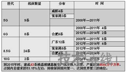 2011年下半年,中國大陸的京東方和華星光電2條8.5代線投產,預計仍將建設一條7.5代線和兩條8.5代線。2012年中國占全球的份額將從目前的5%提高到20%以上,並在2015年成為世界第三大平板顯示生產地。三星、LG、友達和奇美也在擇機擴大其本土8代線產能,業界的產能過剩壓力仍然很大。因此,未來幾年行業多有可能會出現供大於求,價格易跌難漲的局麵。