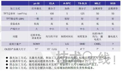 對於AMOLED顯示器對TFT背板的要求,京東方的未來技術研發總監王剛表示,1.TFT載流子遷移率要高,以便在顯示周期內為OLED單元提供足夠載流子注入;匹配OLED的電流效率。2.TFT穩定性,TFT的開關特性不隨工作時間顯著變化,或在可控範圍內變化,以保證從數據信號得到的顯示結果前後一致。3.TFT均勻性,在整個顯示矩陣上,TFT的開關特性趨於一致,減少因特性差異而增加的補償電路。還有,為將OLED用於柔性和透明顯示應用,要求TFT背板的可撓性及透明化;底發射時為提高開口率要求TFT尺寸小。矽基TFT AMOLED技術比較如圖3所示。