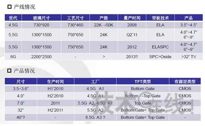 目前,AMOLED市場在迅速擴大。特別是2011年三星顯示器(SMD)推出了Super AMOLED plus,更是加速了AMOLED顯示屏的普及。2011年AMOLED麵板市場份額中,三星約占70%。三星的生產線和產品情況如圖4所示。此外,索尼也於2011年推出了17和25英寸的AMOLED 專業顯示屏。