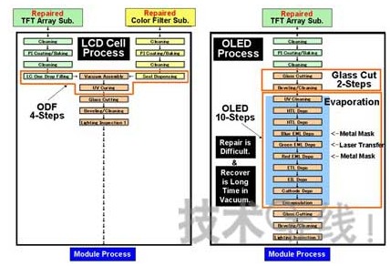 通常背光源用LED來做,因為是點光源,所以還要加上光擴散膜工藝。如用OLED背光源,因為是麵光源,擴散膜工序就可省去,工藝成本下降可觀。2011年,三星、LG已開建用OLED做背光源的TFT-LCD新生產線。