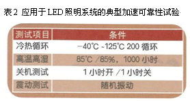 由於LED壽(shou)命(ming)長(chang),通(tong)常(chang)采(cai)取(qu)加(jia)速(su)環(huan)境(jing)試(shi)驗(yan)的(de)方(fang)法(fa)進(jin)行(xing)可(ke)靠(kao)性(xing)測(ce)試(shi)與(yu)評(ping)估(gu)。加(jia)速(su)度(du)測(ce)試(shi)將(jiang)會(hui)模(mo)仿(fang)燈(deng)具(ju)的(de)應(ying)用(yong)條(tiao)件(jian)或(huo)用(yong)戶(hu)要(yao)求(qiu),這(zhe)樣(yang)可(ke)以(yi)更(geng)有(you)效(xiao)地(di)研(yan)究(jiu)各(ge)種(zhong)破(po)壞(huai)機(ji)理(li),提(ti)供(gong)大(da)量(liang)數(shu)據(ju)去(qu)研(yan)究(jiu)LED的結構、材料、工藝從而更好完善LED產品。一些典型的加速可靠性試驗(如表2)。