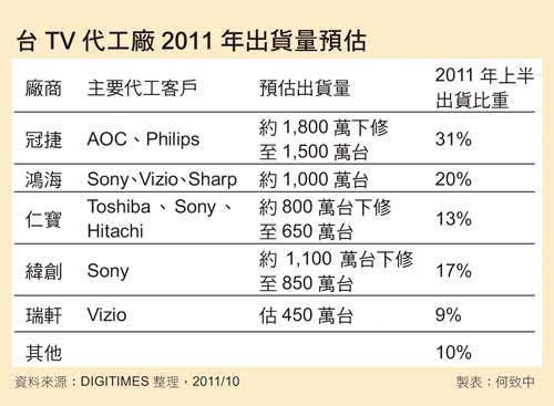 液晶電視製造龍頭冠捷雖握有自有品牌AOC與飛利浦(Philips)品牌訂單,但亦因整體市場需求不佳,下調2011年出貨量,從原先1,800萬台下修至約1,500萬台;緯創第3季表現雖相對較佳,出貨量仍逐月成長,一路從55萬台爬升至80萬台,然近期亦將全年液晶電視出貨量從1,100萬台下修至約850萬台;至於手握Sony液晶電視訂單的鴻海,2011年也麵臨出貨量下修窘境。