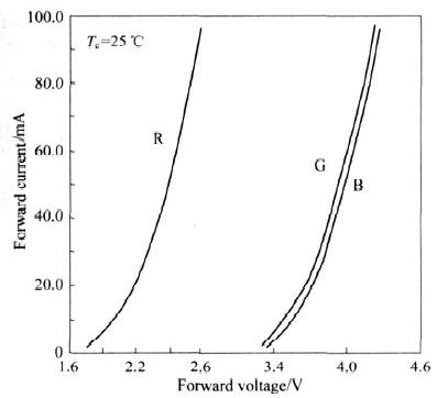圖1 和圖2 反映了一組R、G、B 3 種LED 的正向電壓VF與正向電流IF 以及IF 與亮度L 間的關係。可以看出,超過門限電壓後,隨著VF 的增加, IF 先是緩慢增加而後便急劇增加。