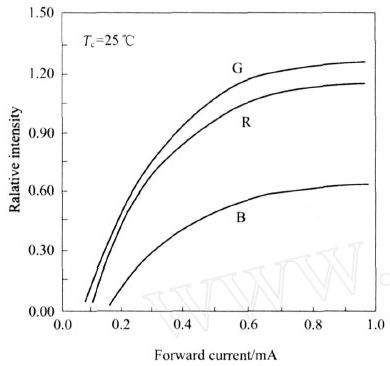從圖2 的IF 與L 曲線可知, IF 的大小直接影響了L 。當IF 達到一定值以後,L 基本趨於飽和。根據圖1 和圖2 的VF 、IF 和L 特性,在實際中通常用VF 的方式驅動LED ,用串連電阻值的大小調整LED 的RGB 三基色的IF 使其L 一致。而係統對RGB 三基色的IF 的調整,是以常溫為基本的標準。