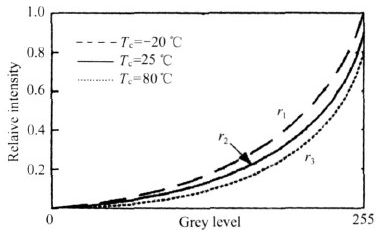 但此方法將損失低灰度級的亮度,降低了圖像的灰度級,即降低了圖像顯示色彩。為了不減少低級灰度且保證對亮度的調整,提出一種針對每個溫度段采用不同的Gamma 參數來調整相關色彩亮度的技術,以補償環境溫度對器件的影響。係統針對不同的RGB 的基色設置其獨立的Gamma 反校正參數。